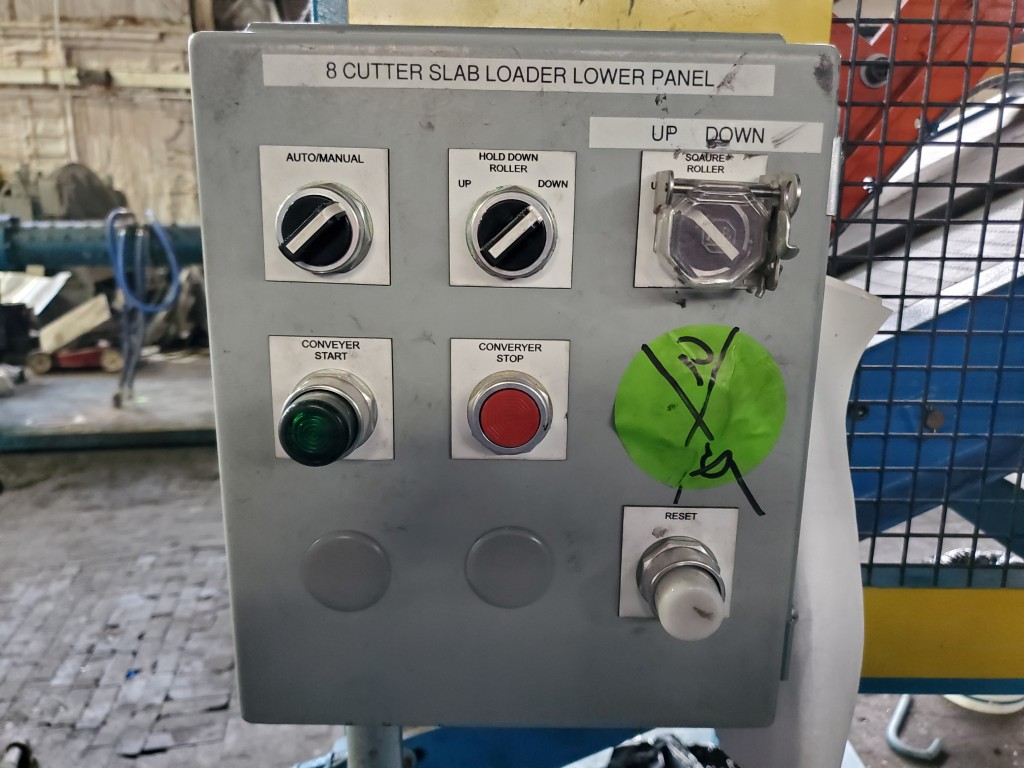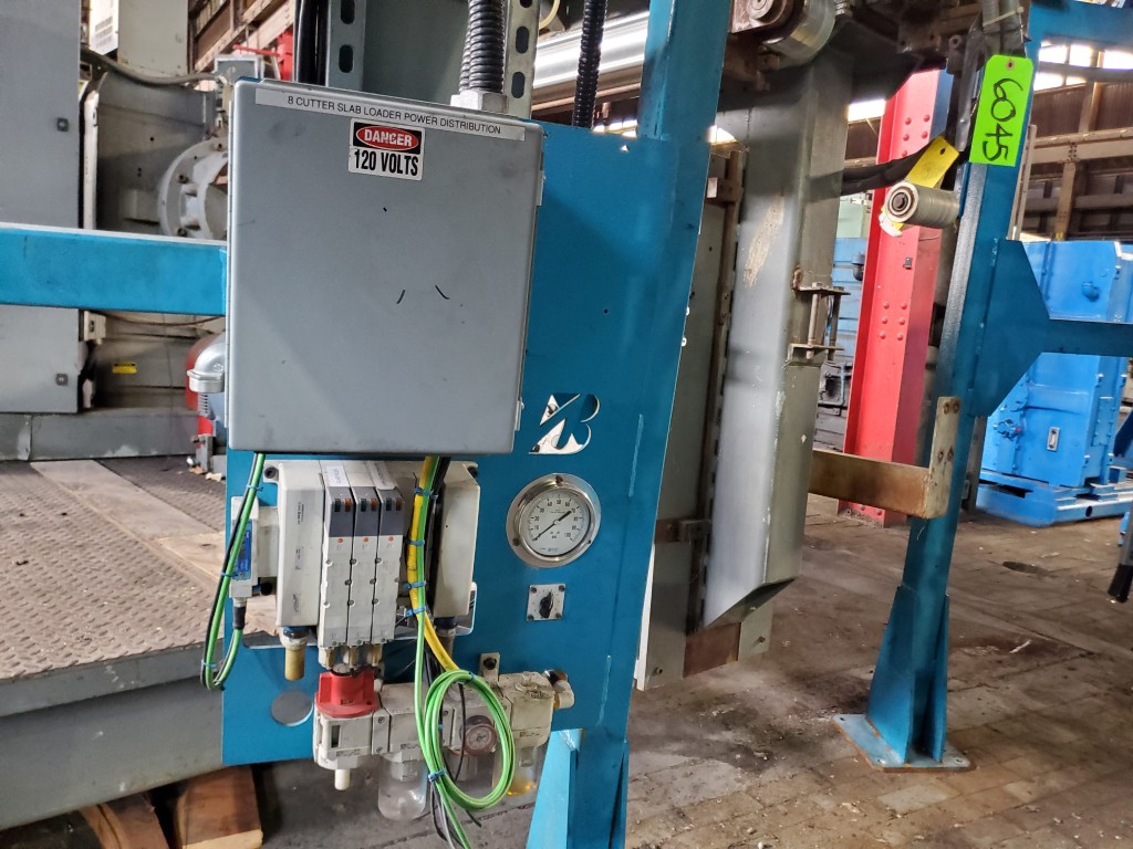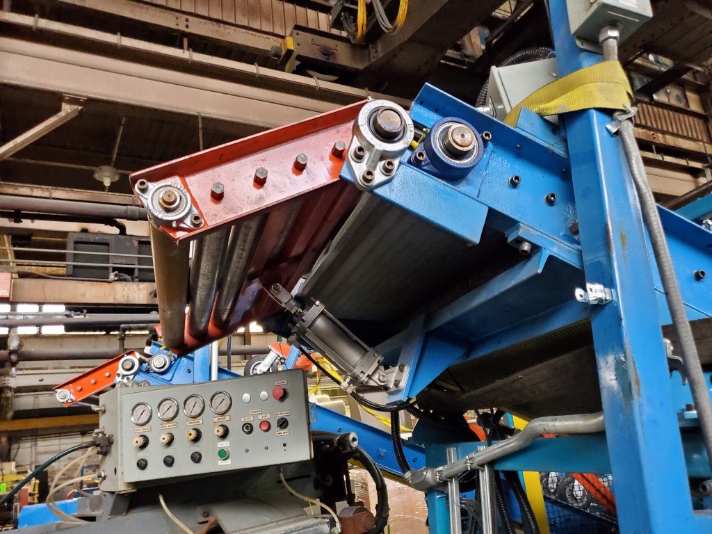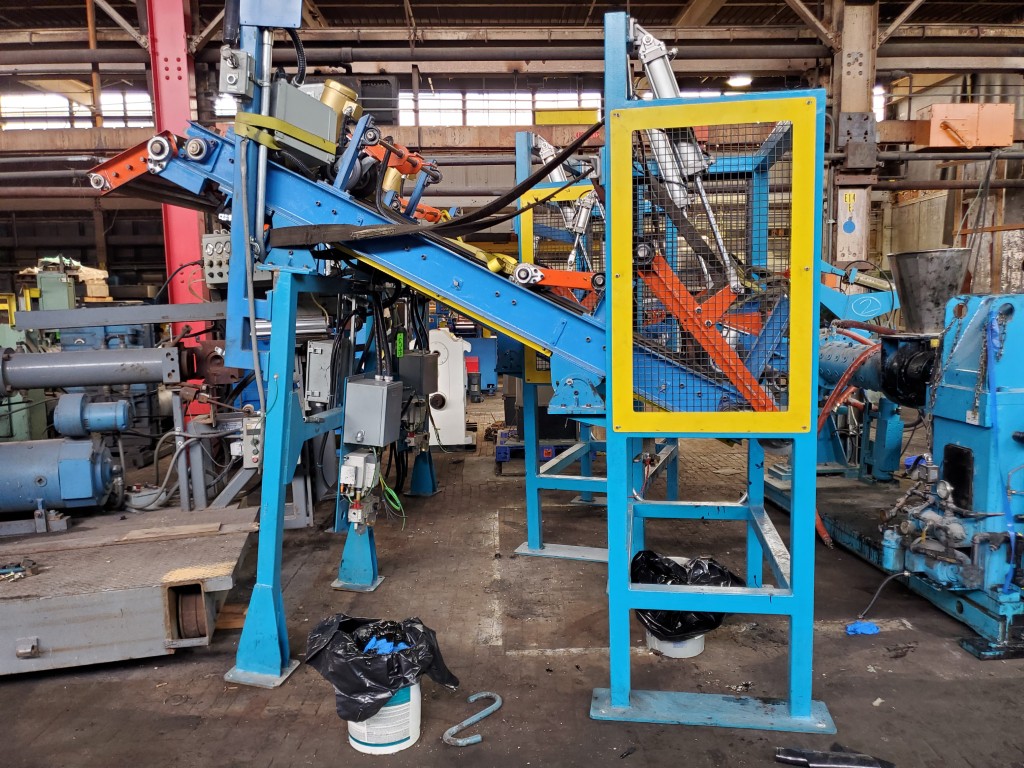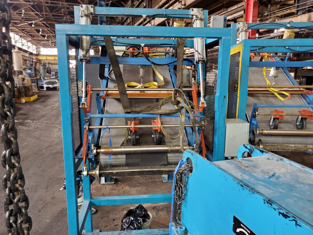 | One (1) Used Intralox inclined feed conveyor, rubber slab loader, 34” wide belt, pneumatic hold down roller, pneumatic wig-wag with 36” wide idler rolls at discharge, complete with operator interface and pneumatic package, previously used to feed rubber slabs to a 6” cold feed extruder. | ||||