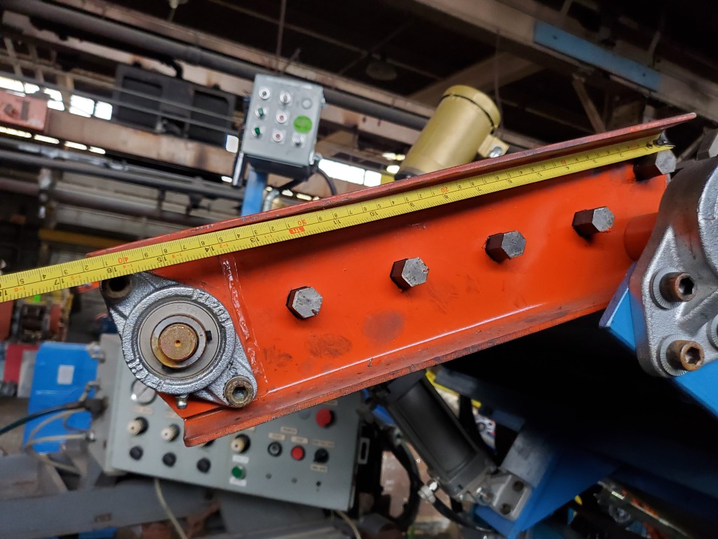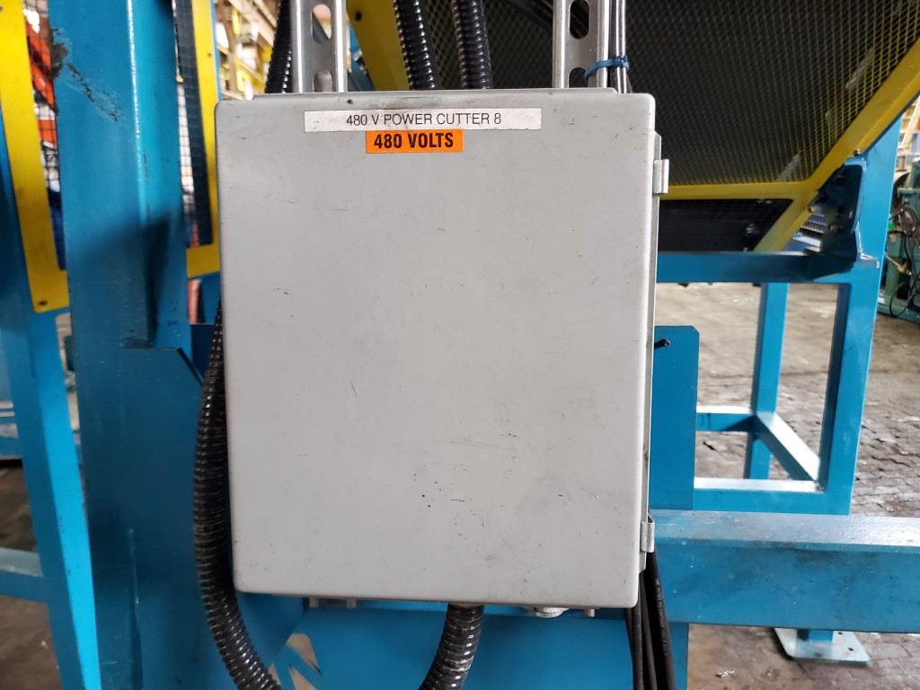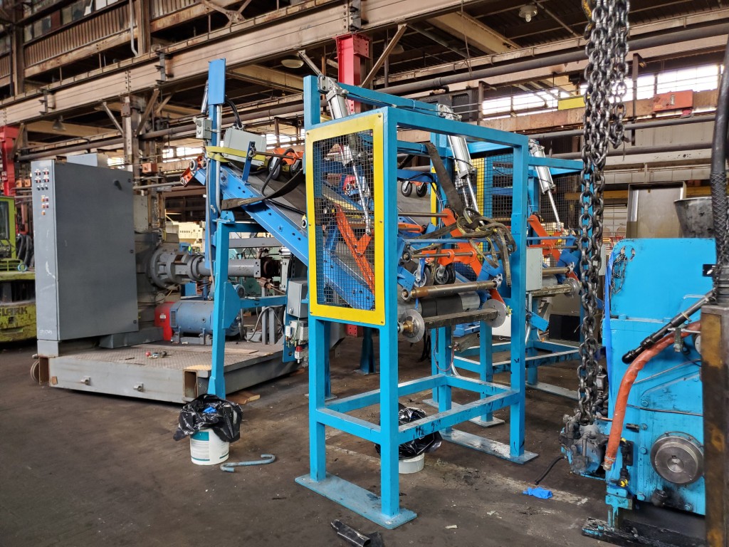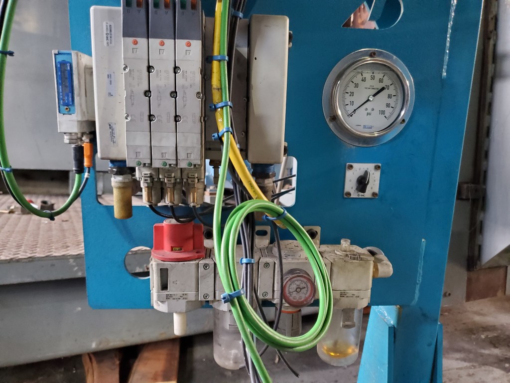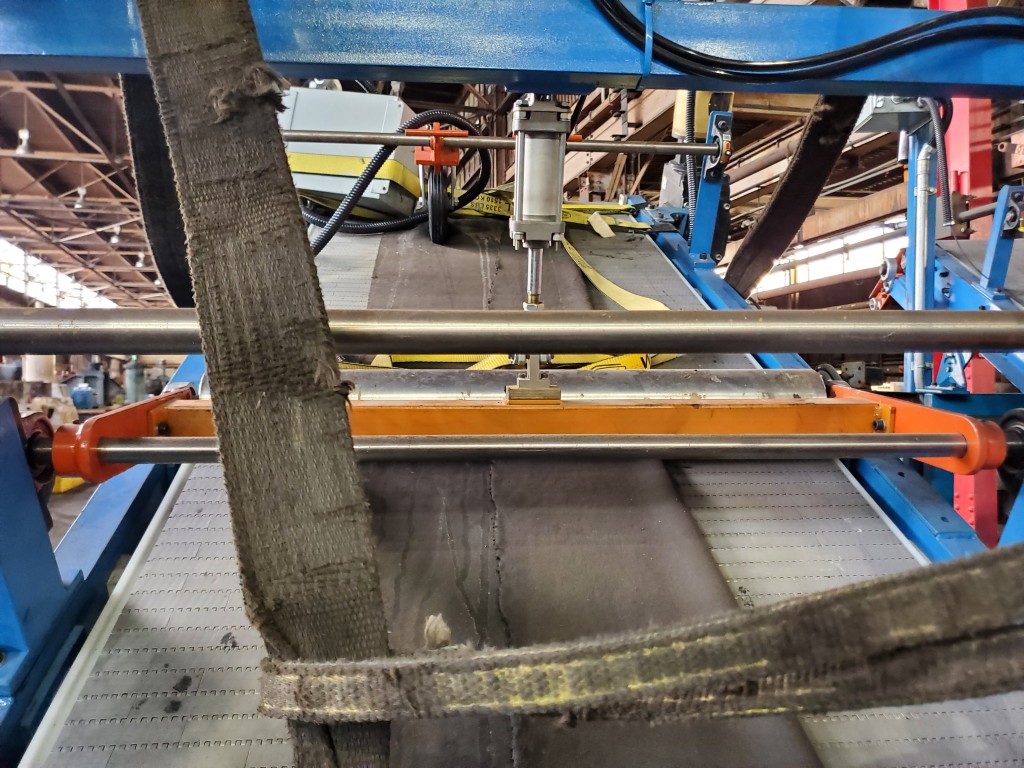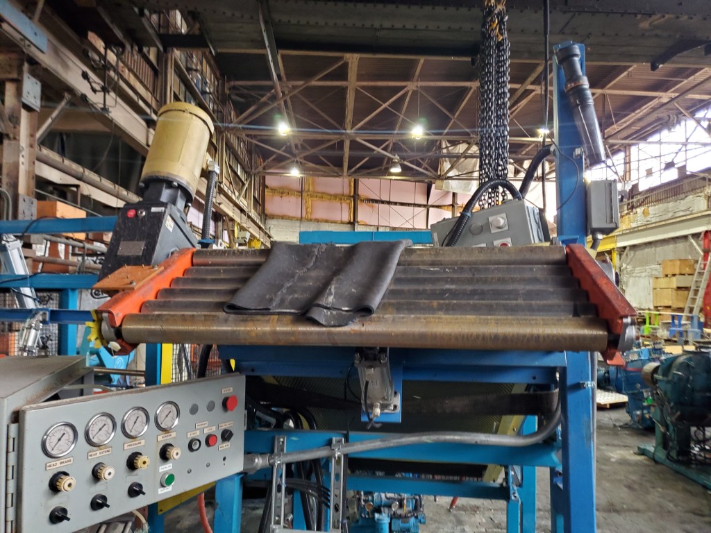 | One (1) Used Intralox inclined feed conveyor, rubber slab loader, 34” wide belt, pneumatic hold down roller, pneumatic wig-wag with 36” wide idler rolls at discharge, complete with operator interface and pneumatic package, previously used to feed rubber slabs to a 6” cold feed extruder. | ||||