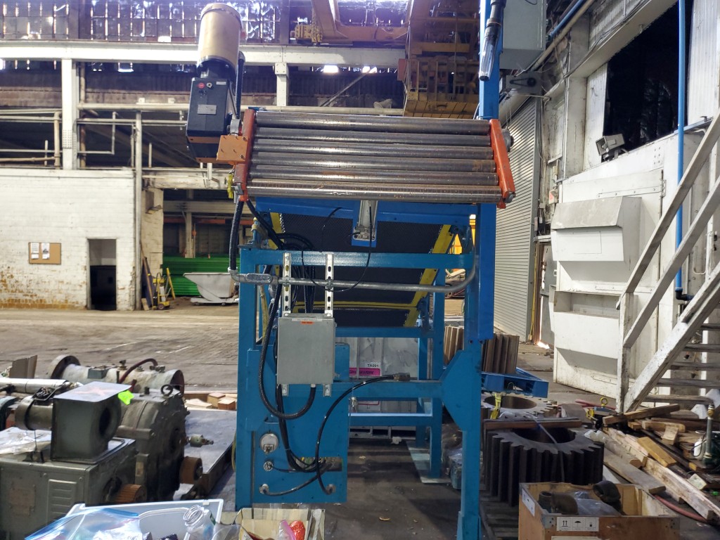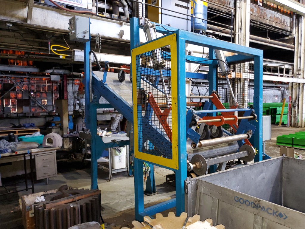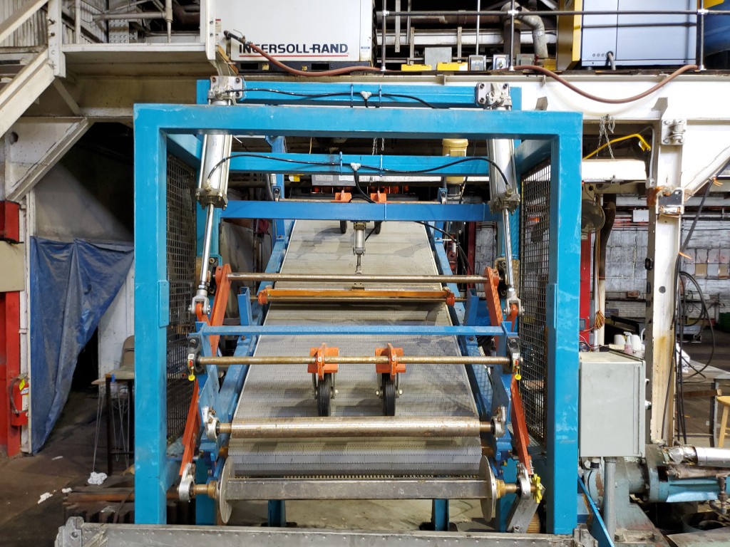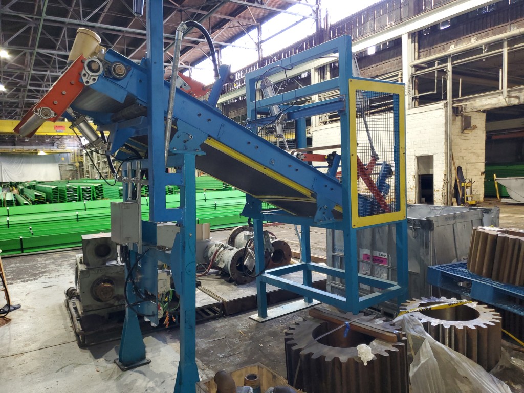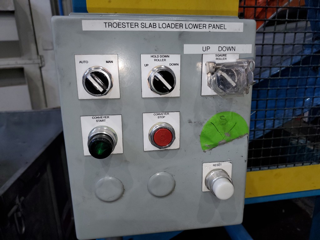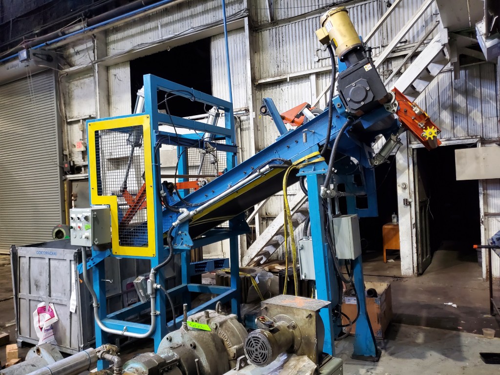 | Item 4723 - One (1) Used Intralox inclined feed conveyor, rubber slab loader, 34” wide belt, pneumatic hold down roller, pneumatic wig-wag with 36” wide idler rolls at discharge, complete with operator interface and pneumatic package, previously used to feed rubber slabs to a 6” cold feed extruder. | ||||