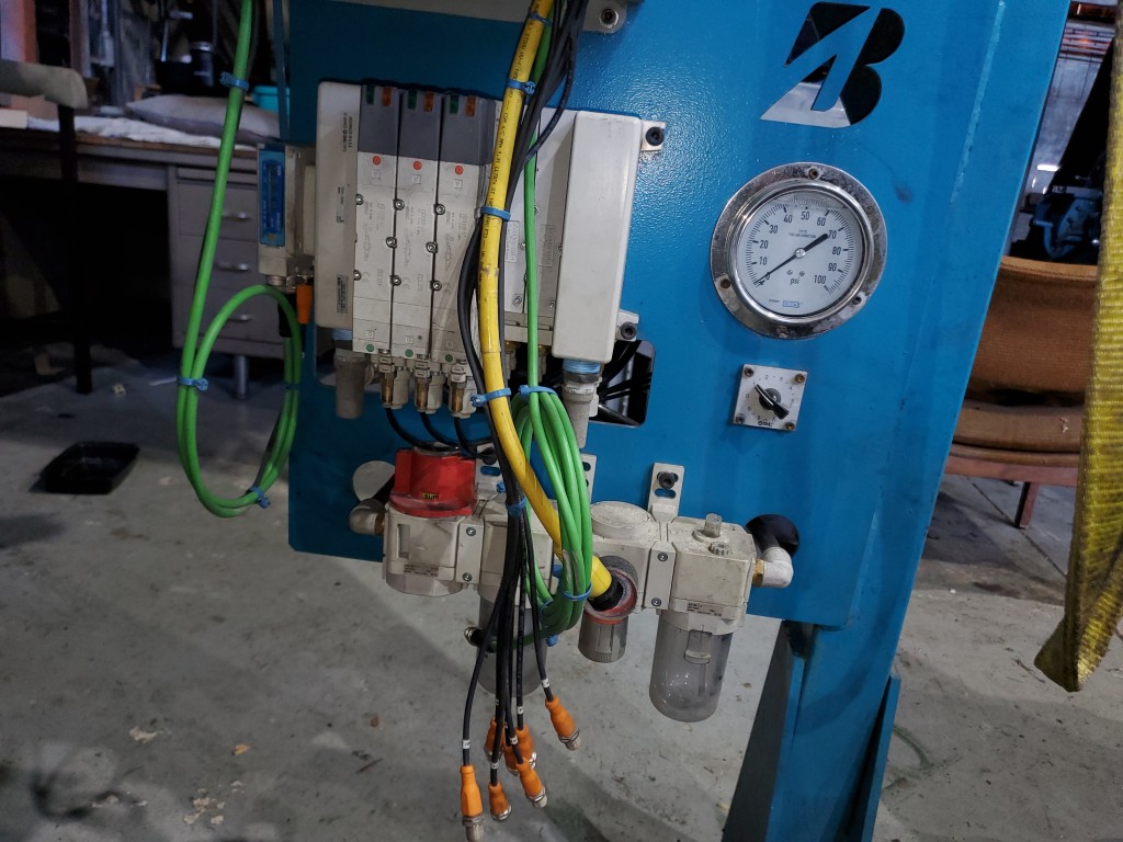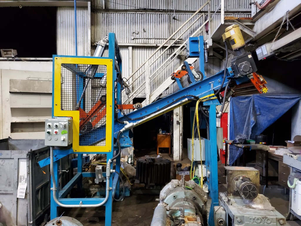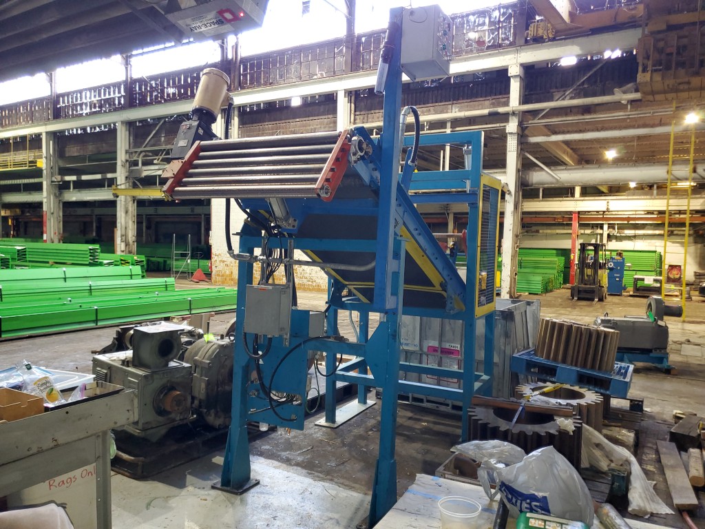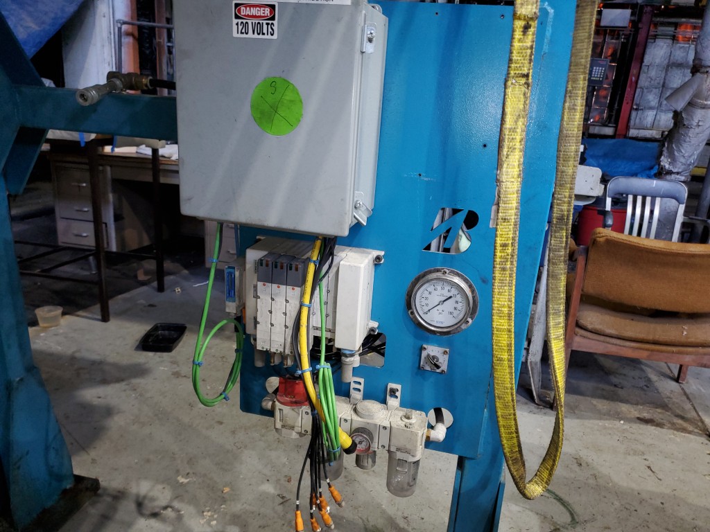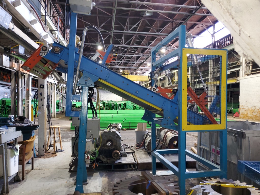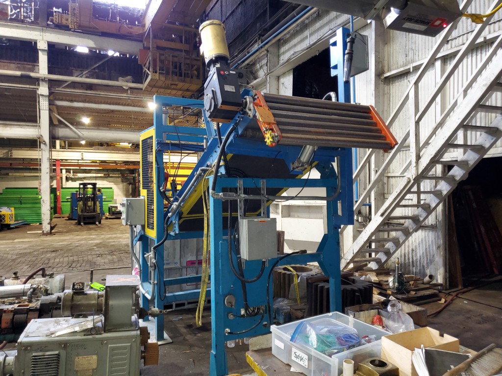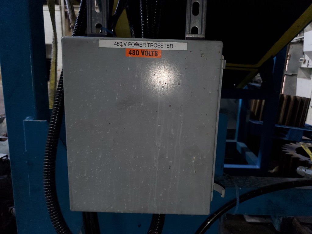 | Item 4723 - One (1) Used Intralox inclined feed conveyor, rubber slab loader, 34” wide belt, pneumatic hold down roller, pneumatic wig-wag with 36” wide idler rolls at discharge, complete with operator interface and pneumatic package, previously used to feed rubber slabs to a 6” cold feed extruder. | ||||