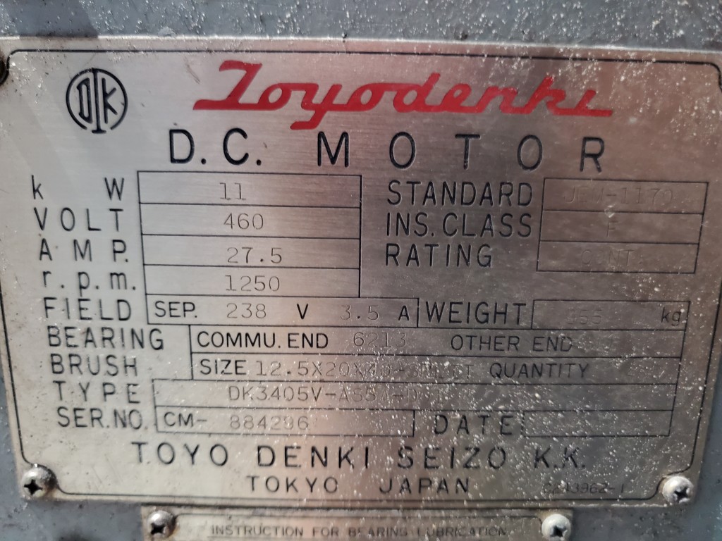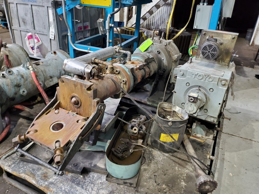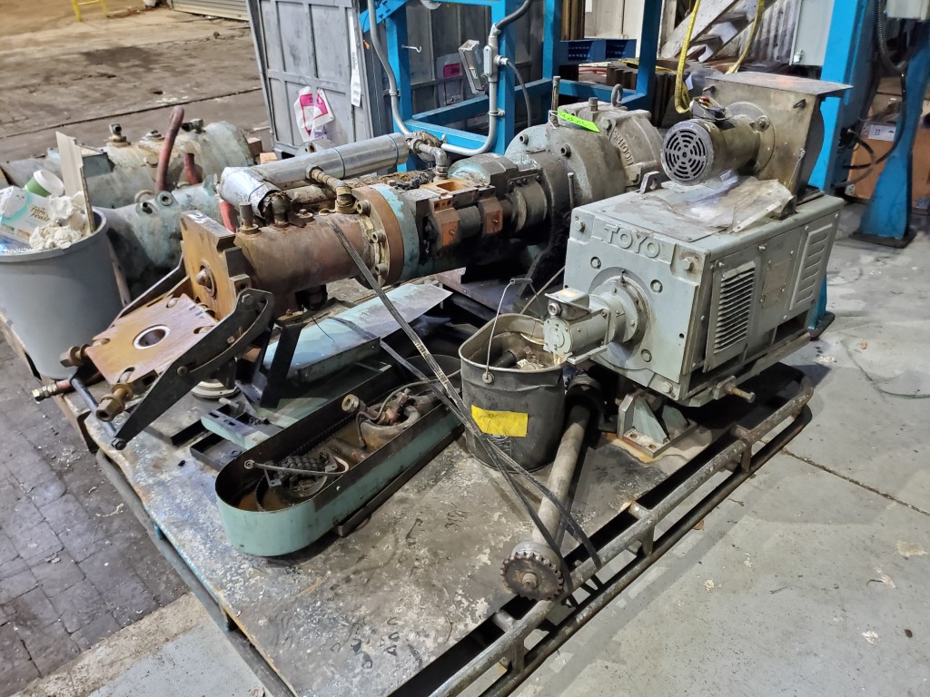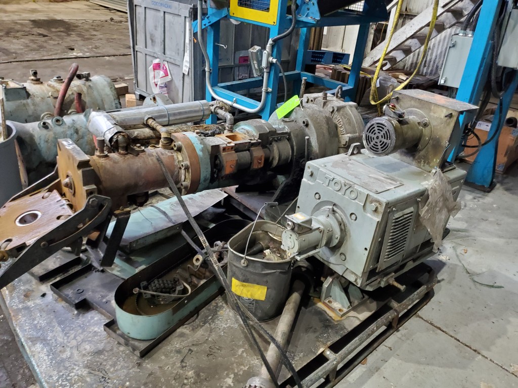 | Item 6010 - One (1) Emerson 2.5" 60mm Cold Feed Rubber Extruder, Model SM100HF, 12:1 L/D, 25:1 G/B ratio, Toyo 15 HP 1250 RPM 460 VDC motor, forced lube system, PFR power feed roll equipped with external bearings and adjustable scraper blade | ||||