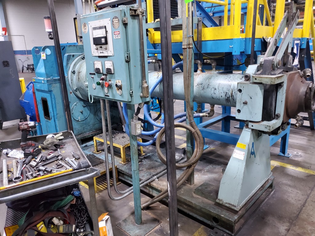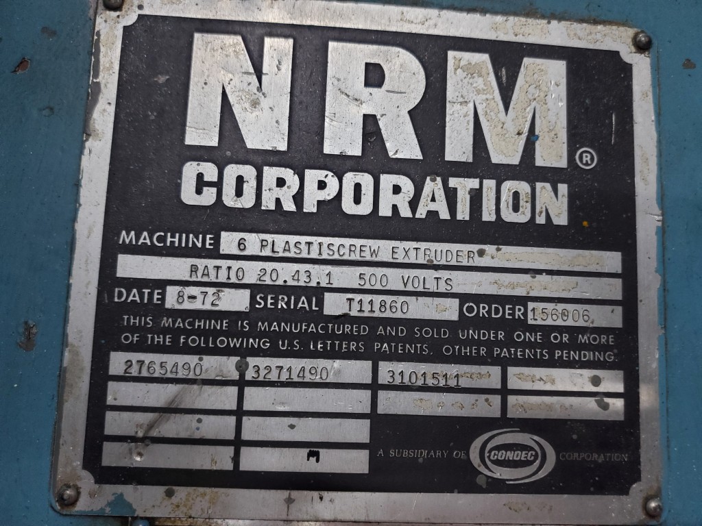 | Item 6106 - One (1) Used NRM 6" 150mm Cold Feed Extruder, 12:1 L/D, 20.43:1 G/B ratio, straight delivery head with Kwik clamp assembly, forced lube system, PFR power feed roll equipped with external bearings and adjustable scraper blade | ||||