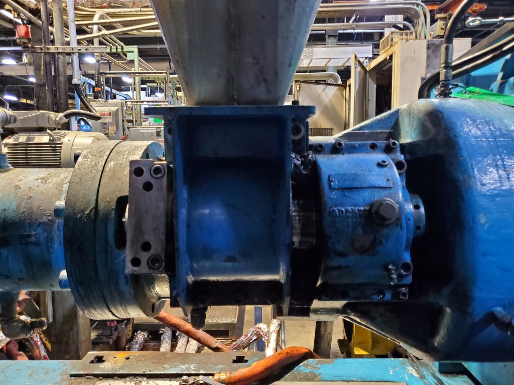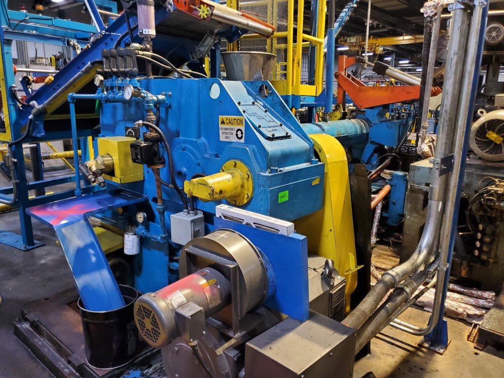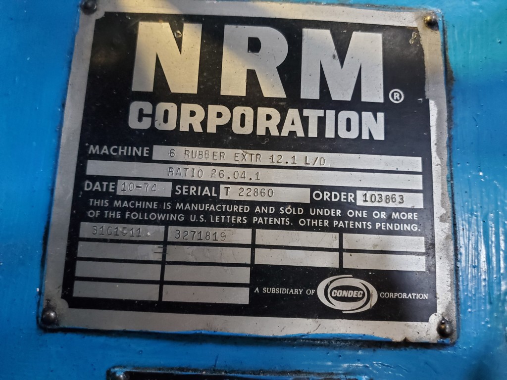 | Item 6107 - One (1) Used NRM 6" 150mm Cold Feed Extruder, 12:1 L/D, 26.04:1 G/B ratio, straight delivery head with pneumatic clamp assembly, forced lube system, PFR power feed roll equipped with external bearings and adjustable scraper blade | ||||