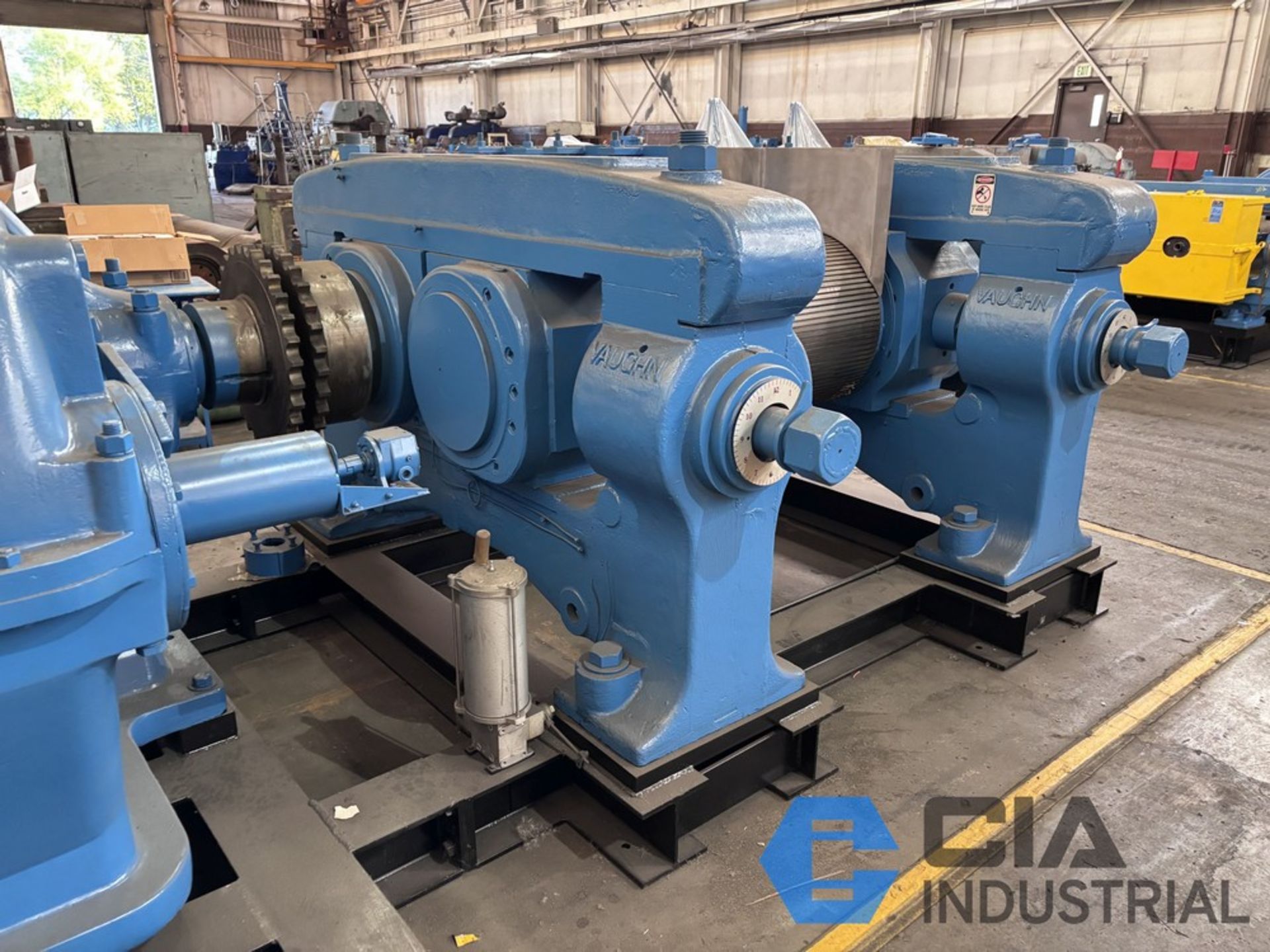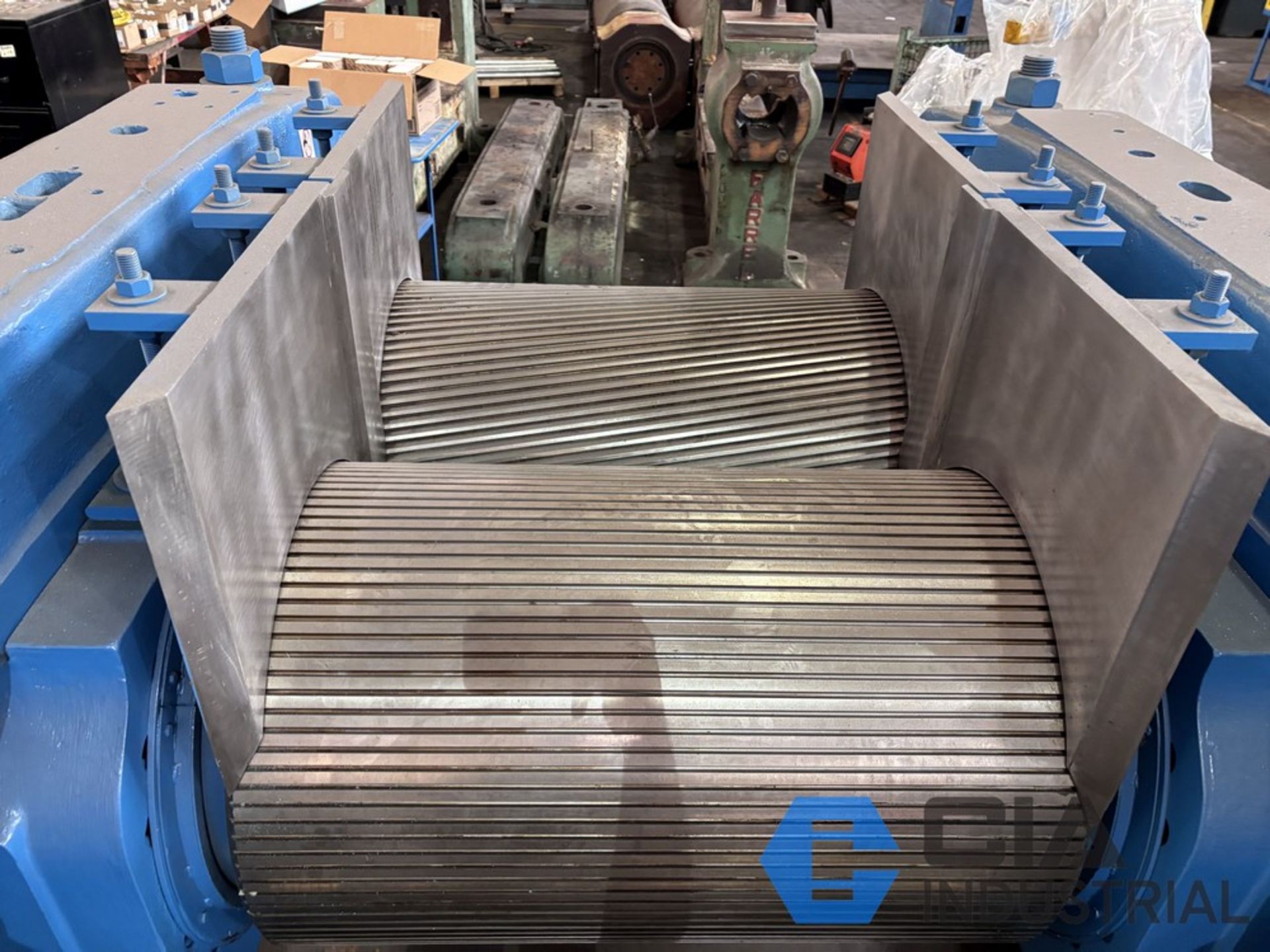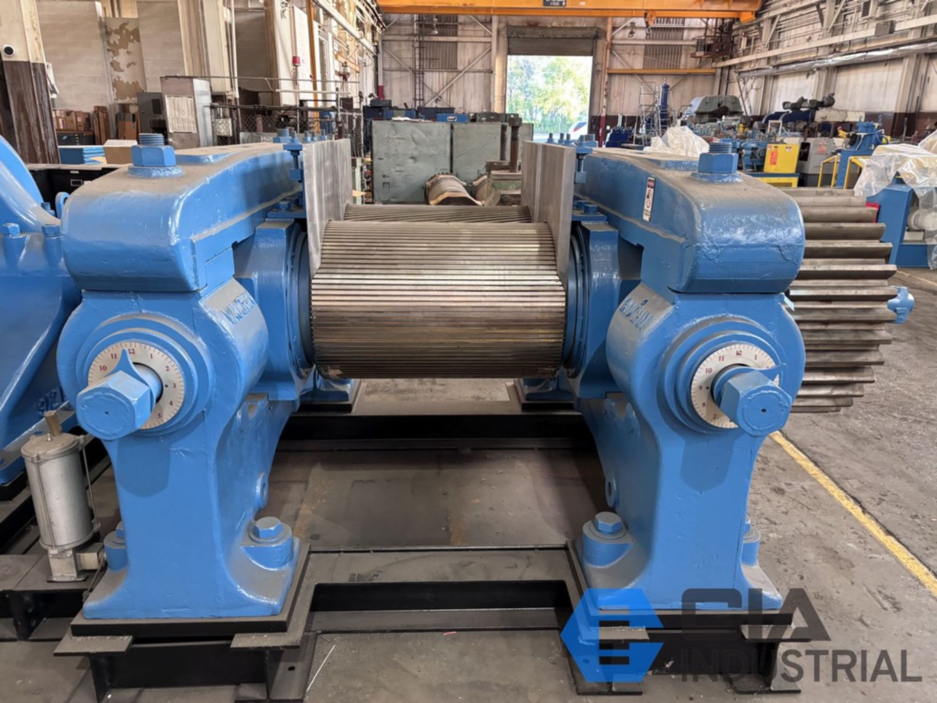 | Item 2159 - One (1) Vaughn 24" x 24” x 36”, 610mm x 915mm, 2-Roll Rubber Cracker Mill, Motor GE 250 HP 735 RPM 380 VAC, Gearbox Lufkin D912 28.72:1 reduction ratio direct drive gearbox, NEW rolls, NEW stock guides, NEW full circle bronze bushings, manual nip adjustment, top cap design, unitized base | ||||