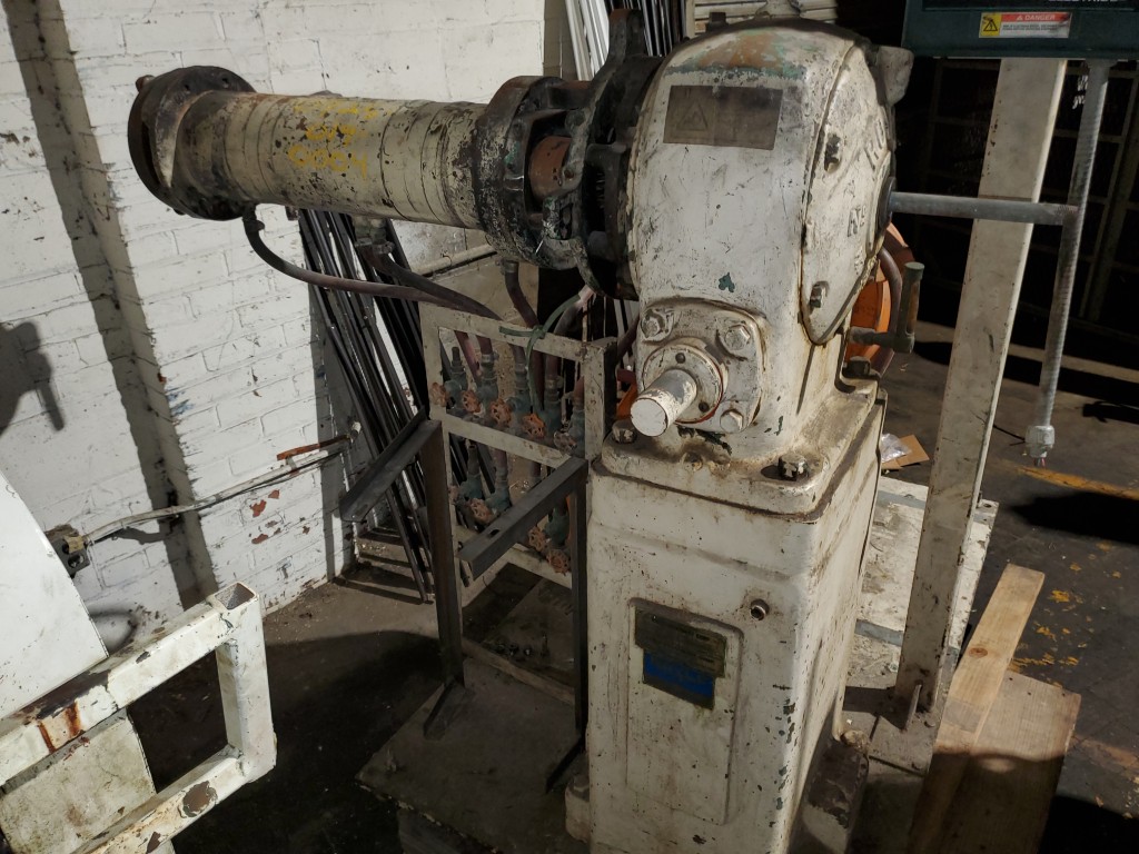 | Item 6008 - One (1) Royle 2.0" 50mm Cold Feed Rubber Extruder, 12:1 L/D, 15:1 G/B ratio, No motor, Reliance 15 HP 460 VAC drive with controls, straight delivery head, forced lube system, individually driven roller feeder assembly, feed roller equipped with external bearings. | ||||
