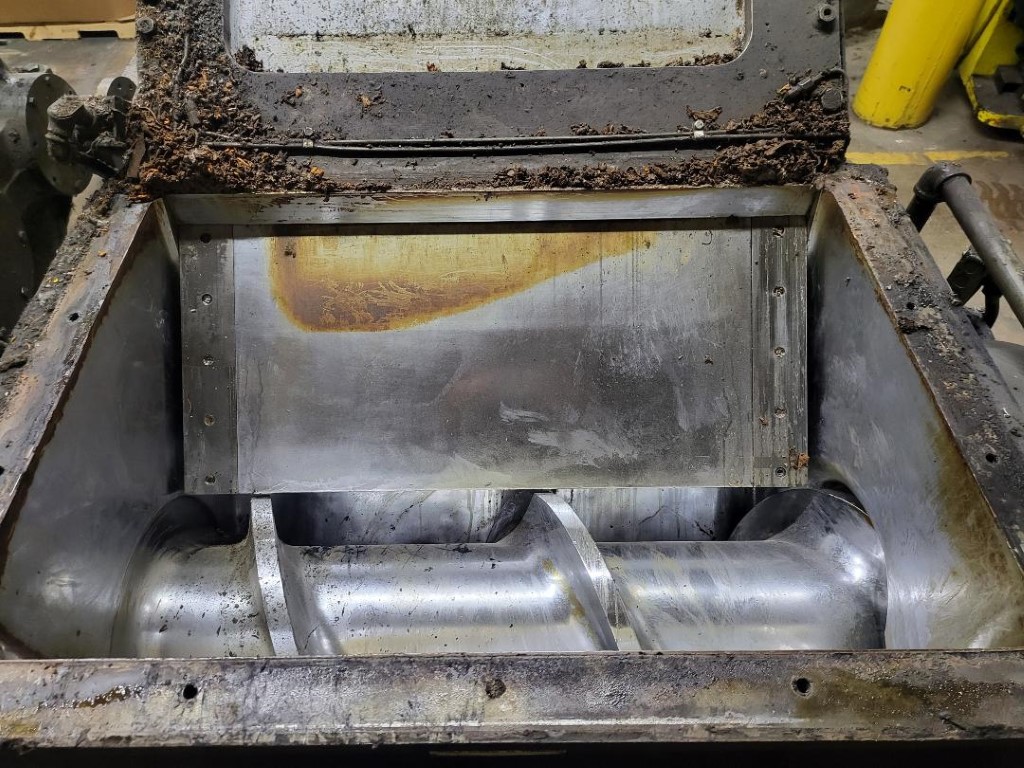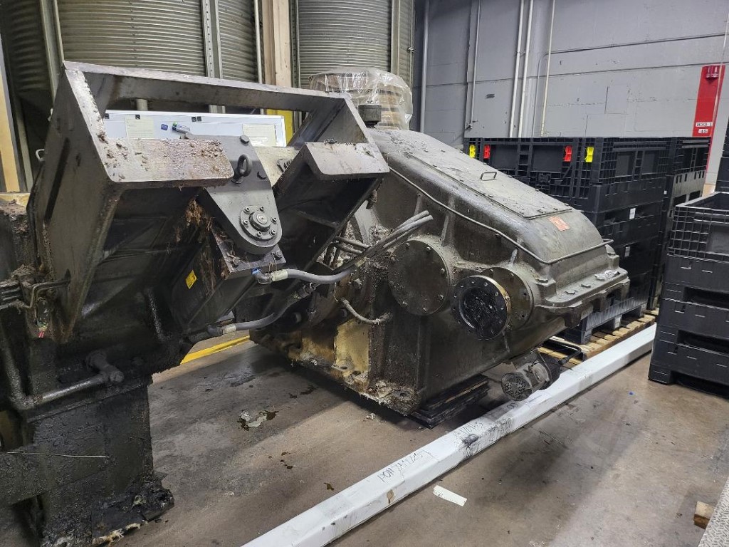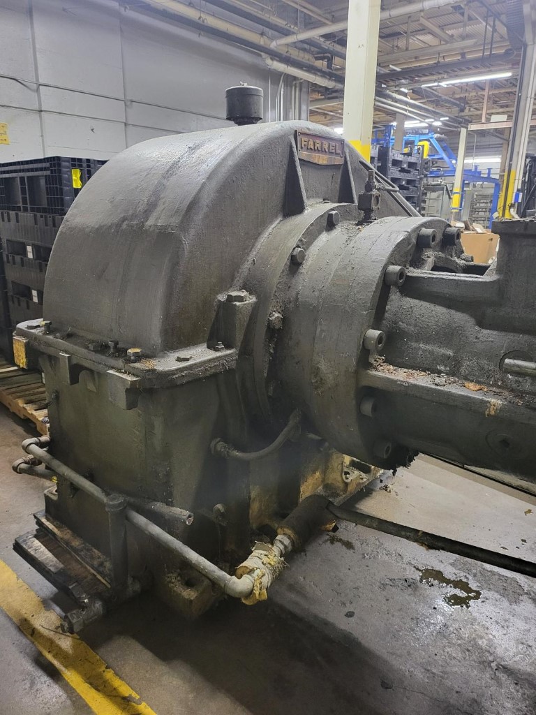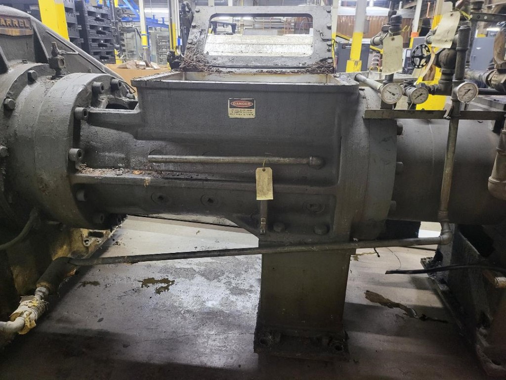 | Item 6205 - One (1) Used Farrel 15” Dump Extruder, drop extruder, hot feed extruder, feed opening 36” wide x 24.5” deep, stuffer 35” wide x 8” thick with 13” stroke, 95:1 total gearbox reduction (19.4:1 primary gearbox X 4.93 secondary gearbox), GE 200hp 1150/1800 RPM 500 VDC motor, enlarged feed section, pneumatic stuffer ram, no head, Screw Speed 12-20 RPM, S/N 78A1468 | ||||