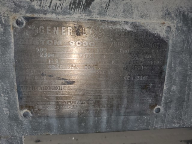| Item 7325 - One (1) Used GE General Electric Motor, 500 HP, 880 RPM, 2300 VAC, 348 Amp, Frame 8210S | ||||